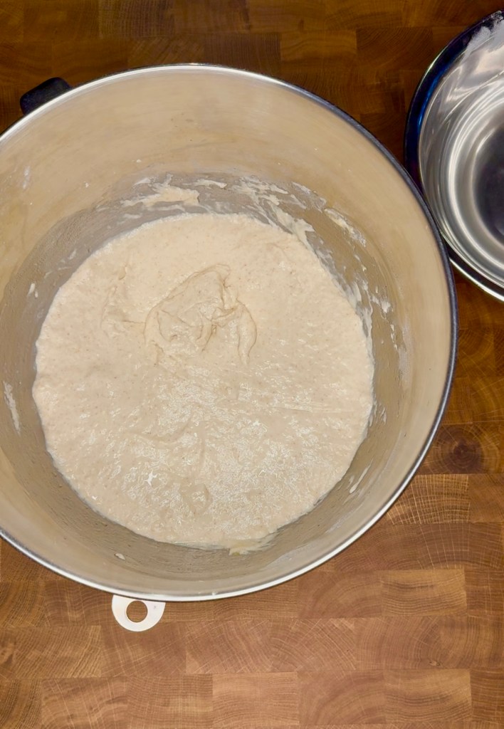 1. Place sour starter in mixer bowl with first water and mix till sour starter is dissolved in water